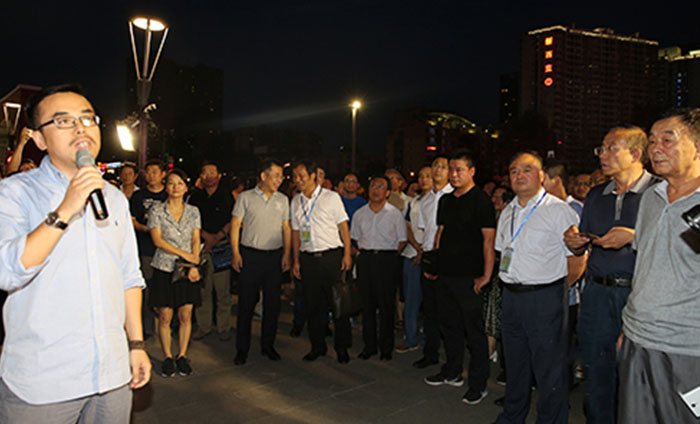 首先考察組一行來到唐城墻遺址公園北廣場,高新區夜景照明及唐遺址公園燈光秀的總設計師、北京信達電通科技董事長王春龍先生給眾領導講解由信達電通設計策劃的高新區夜景亮化提升方案。