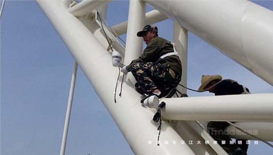 在安康的城東漢江大橋中,橋梁的照明工程施工已經(jīng)進(jìn)行到高空作業(yè)部分,現(xiàn)在現(xiàn)場(chǎng)在用吊車配合作業(yè)進(jìn)行LED燈具的安裝工作。