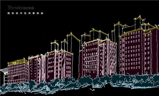 風景御園位于西安市經開區鳳城八路,在市政府對面,本項為商業辦公樓夜景照明設計,建筑的立面材質為淺色石材為主。四棟建筑的建筑形態相同,沿縱向結構游走,整體造型簡潔、大氣,本項屬于高層建筑。