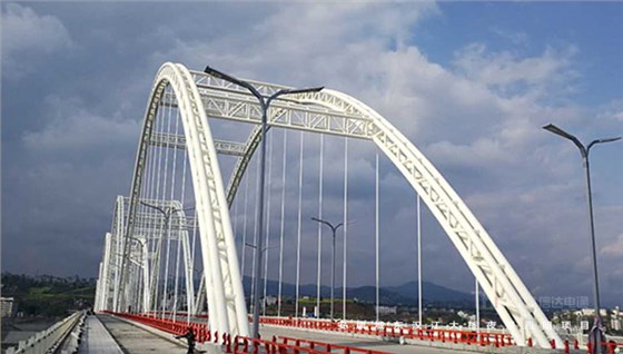 安康市城東漢江大橋軸線呈南北走向,大橋?yàn)閯偭喝峁暗钠呖紫禇U拱橋,中間五孔設(shè)置拱肋。整體簡(jiǎn)潔、大方、現(xiàn)代、美觀,橋梁主體為乳白色,橋墩及梁腹顏色為亞灰色,大橋全長(zhǎng)1907.21m,其中主橋長(zhǎng)810.0m,南北引橋共長(zhǎng)1097.21米,橋軸線與漢江基本正交,與江南巴山東路設(shè)分離式立交,與江北G316設(shè)環(huán)形平交(遠(yuǎn)期成菱形立交),本項(xiàng)目為獨(dú)立特大橋工程。