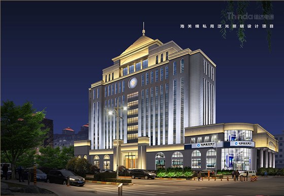經過信達電通夜景照明設計師泛光照明改造工作后,建筑照明層次清晰,明顯能夠體會到建筑厚重感在燈光修飾下的體現,建筑主體正面上部中心處代表緝私局的商標被重點突出,這樣能夠獲取注意力的吸引,而不是依靠附屬的建設銀行起到代表的作用,建筑主體的身份代表得到回歸。