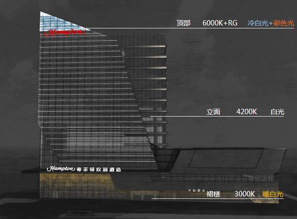 整座酒店形成照明層次,在建筑頂部區(qū)域營造天際線,光色上選用6000K冷白光和彩色光。建筑中間區(qū)域立面作為過渡段,起著承上啟下的作用,選用4200K的白光。建筑裙樓部分作為底部基座,光色選用3000k的暖白光,給游客帶來舒適的視覺體驗。
