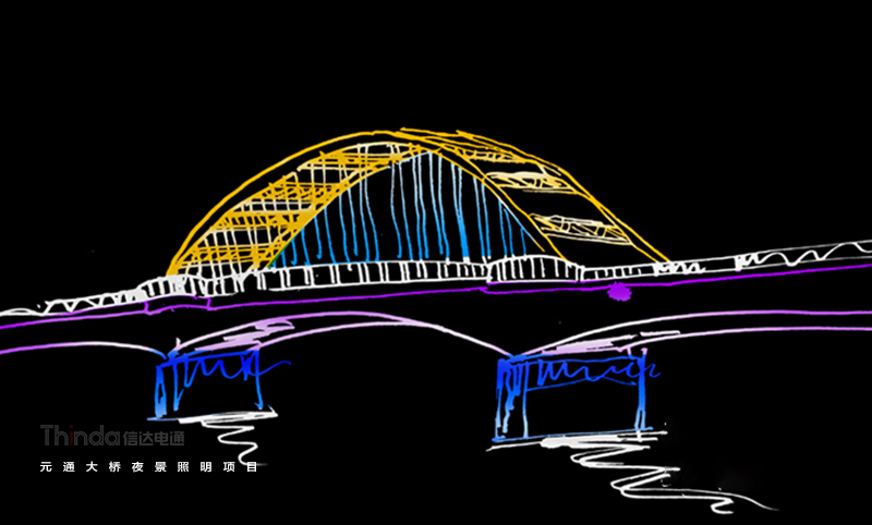 元通大橋北起靖遠路高架橋,主跨跨越黃河,全長459米,屬于城市次干路。信達聯合橋梁照明設計師對元通大橋進行全面調研定并針對橋梁功能、夜景需求進行設計,設計手法動靜結合,簡單與復雜、精致與粗獷、明與暗、虛與實、冷與暖在燈光中體現。
