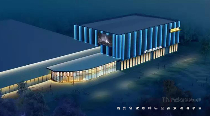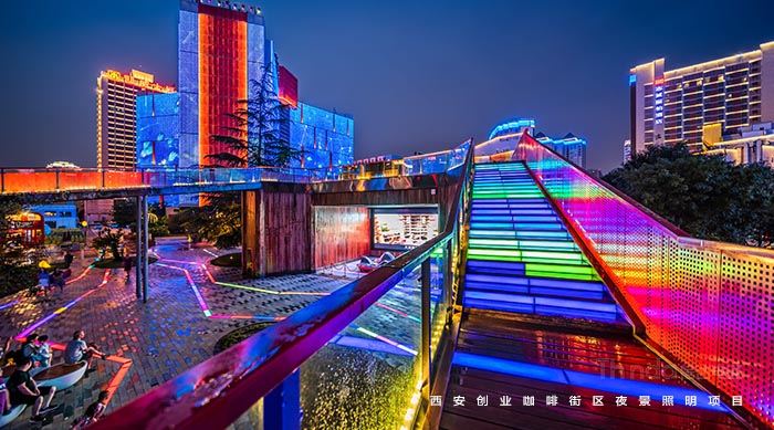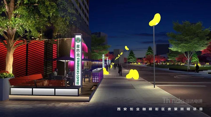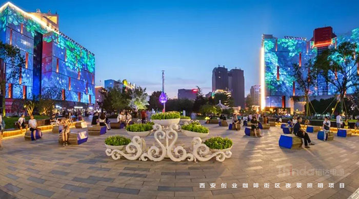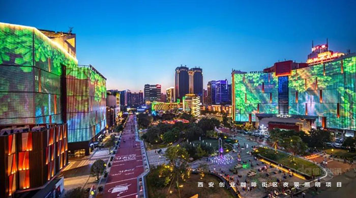 信達(dá)電通在2017年完成了眾多大型城市亮化項目,其中濃墨重彩的一筆當(dāng)屬西安創(chuàng)業(yè)咖啡街區(qū)的亮化。