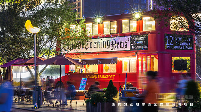 西安創(chuàng)業(yè)咖啡街區(qū)是西部的投資熱土和創(chuàng)業(yè)天堂,為打造創(chuàng)新創(chuàng)業(yè)新地標(biāo),信達(dá)電通通過明與暗、動與靜、冷與暖、光與影的對比,為西安創(chuàng)業(yè)咖啡街區(qū)夜景提升設(shè)計創(chuàng)造出具有層次感的燈光環(huán)境。周圍建筑與景觀改造形成統(tǒng)一步調(diào),咖啡杯、水滴景觀、咖啡豆等景觀裝置和雙層咖啡巴士的創(chuàng)新設(shè)計提升咖啡街區(qū)的趣味性和藝術(shù)性,打造年輕、時尚、有活力的空間,形成西安新地標(biāo)。