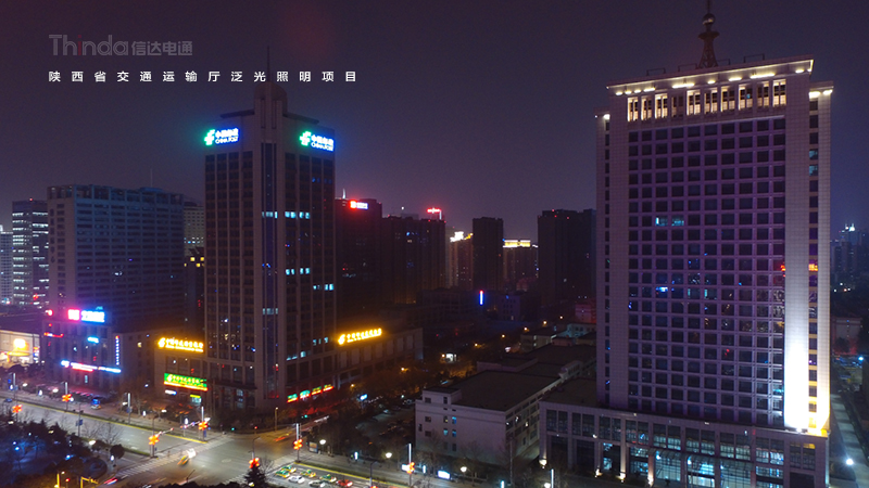 陜西省交通廳是2016年西安高新區整體區域照明設計規劃的一份子,電通根據建筑特點以及所處的地理位置結合周邊的建筑和景觀,對陜西省交通運輸廳進行照明設計改造工作。設計后的夜景照明效果強調天際線效果,同時增加建筑立面層次感。暗區與明區想映襯,凸顯建筑主體。
